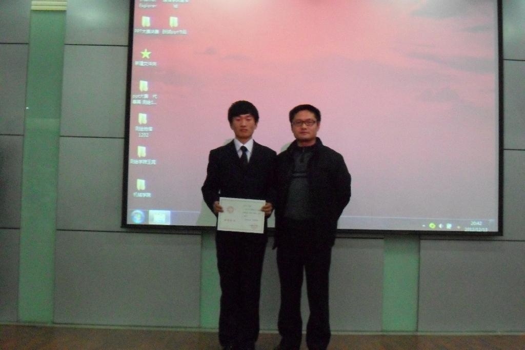 校团委副书记周涛老师为一等奖获得者赵飞飞颁奖