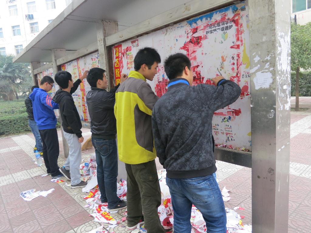 上午八时许,参加本次义务劳动的员工在中心广场准时集合,分为三组,有序的开始了清除工作。分别对教学区、生活区和图书馆区域的宣传栏、广告牌、校车站牌等处进行了彻底的清除。三组同学分工合作,齐心协力完成了清除任务,两个小时后所见之处焕然一新,清理工作顺利完成。