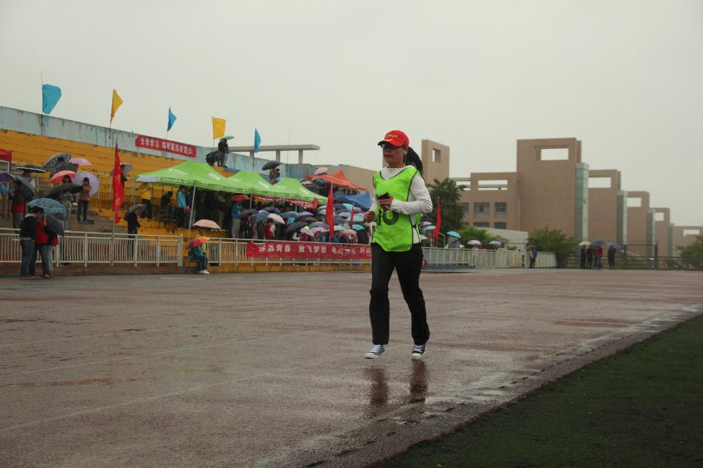 竞走项目不仅考验个人的体力,同时还考验着一个人的毅力。在这恶劣的天气环境下,公司运动员高丽丽蓄势待发信心满满,伴随着一声枪响,比赛开始。她泰然自若并始终保持着前三的节奏,其他队员的犯规丝毫没有干扰到她,只有一声声的“机械机械,横扫一切”让她脚下的步子更加沉稳,能取得好成绩的信念更加坚定。最后一圈时,运动员脸上的雨水肆意流淌,走在前三的选手们实力相当,比赛结果尚难分晓,这时公司啦啦队的加油声为她最后冲击冠军鼓足勇气。终于,在离终点线20米的地方,公司选手加快步伐冲向胜利的终点,超越了第二名,最终成为了本次女子组竞走亚军。