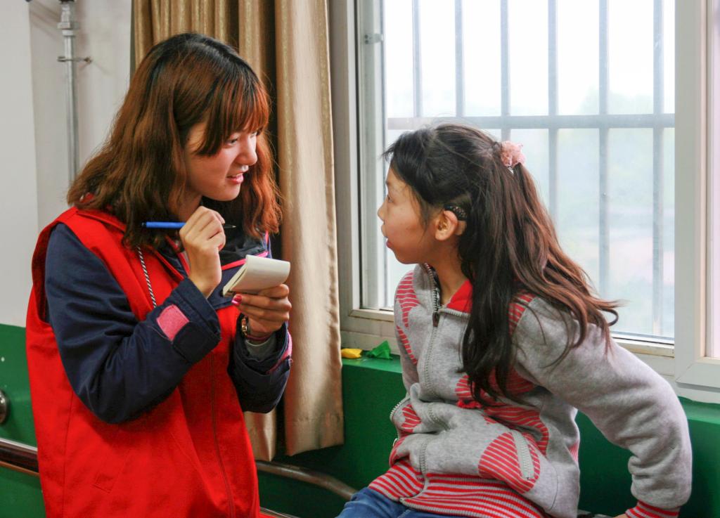 志愿者们走进教室,在小本子上写字和用手语沟通与特殊教育公司的孩子们认识交流。期间,志愿者们为孩子们带来了节目:军体拳表演和《感恩的心》手语表演,精彩的表演让孩子们脸上都洋溢着灿烂的笑容,孩子们也向志愿者们学习军体拳,参与到节目中去。在接下来的游戏环节里,教室里充满了气球的爆炸声和孩子们欢快的笑声,把活动气氛推向了高潮。最后,志愿者们给各位聋哑儿童发放了本子、笔等小礼物,与孩子们进行了告别。