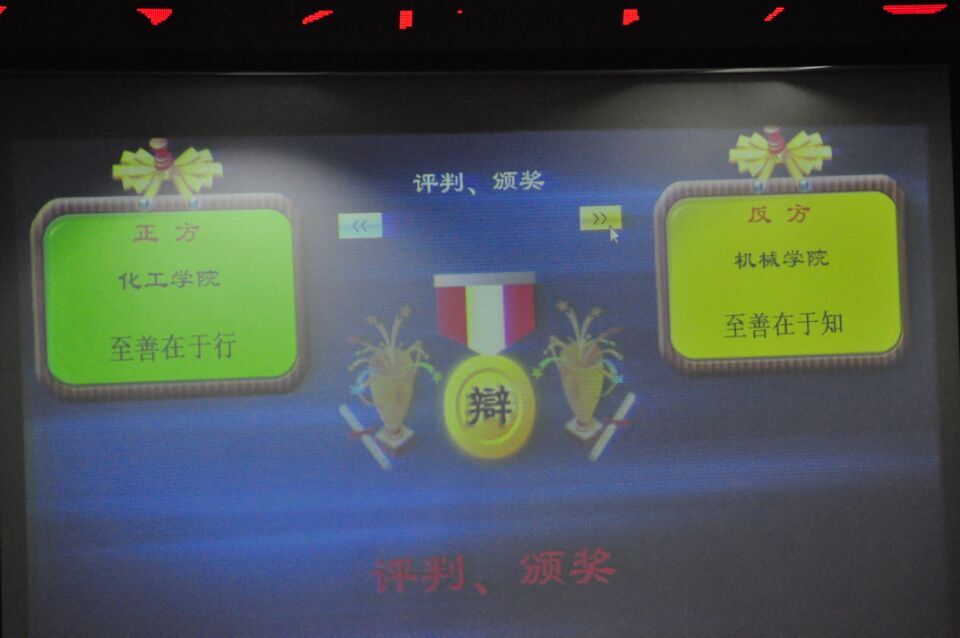决赛中,辩论主题为“至善在于行还是知”,分为各方观点陈述、相互提问和自由辩论三个环节。担任正方的是化工公司代表队,担任反方的是公司代表队,所持观点为“至善在于知”。公司由2015级井天智、李阳、王师煜、邢迎光、李腾腾同学组成代表队在比赛中引经据典、旁征博引,经过激烈的辩论最终获得第一名。