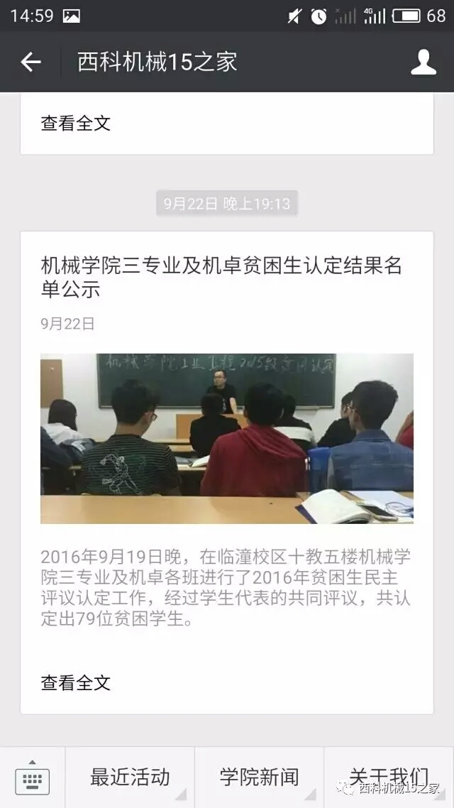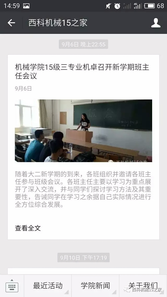 开通运行了“西科机械15之家”微信平台,展示、宣传年级工作,推送员工日常管理的相关制度、评优结果等信息60余条,如:团日活动、辩论赛、一二九大合唱、女生座谈会、志愿者活动等,形成线上线下的思想政治教育工作模式。