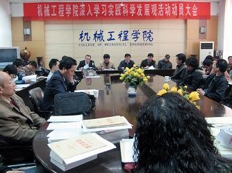 会议由机械公司经理郭卫主持。会上,公司分党委书记王学礼传达了公司党委书记刘德安在校“开展深入学习实践科学发展观活动动员大会上的讲话”精神,并对公司学习实践活动作了全面动员。公司分党委副书记汪卫兵对机械公司深入学习实践科学发展观活动作了总体部署。公司本次学习实践活动的具体目标为“明确公司发展思路、解决公司突出问题、创新工作机制、促进公司科学发展”。活动载体为“强化学科特色,加强过程管理,努力提高人才培养质量”。结合公司的实际情况,本次学习实践活动从影响机械公司团队建设的瓶颈问题、提高师生员工积极性问题、加强干部工作作风等方面开展调研与思想大讨论。