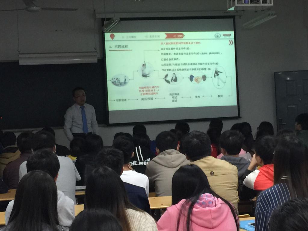 10月20日,公司借助公司教师力量邀请江苏省沭阳县人事局及所属近百家当地企业的部分负责人来公司召开大型专场招聘宣讲会。宣讲会于当天下午14:30在9教101教室进行。会上,瑞声精密电子沭阳有限公司、江苏威拓公路养护设备有限公司等企业先后做了公司招聘宣传,现场气氛活跃。