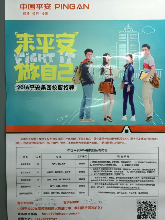 10月27日,平安产险陕西分公司在公司501教室进行专场招聘会,招聘会于当天16:00-17:30进行。从10月中旬开始平安产险陕西分公司便与公司取得联系,表达欲招聘公司毕业生的意愿,经过多次协商和前期宣传,最终确定整个招聘环节。在招聘会现场,毕业生们积极踊跃参与各个互动环节,并通过现场投递简历和初步面试确定了部分招聘对象。
