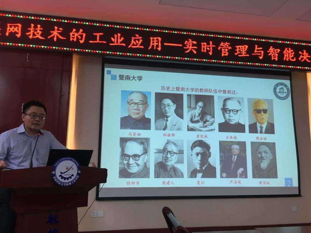 6月29日下午,暨南大学电气信息公司经理、工业工程专业负责人、博士生导师屈挺教授应邀在公司雁塔校区作了题为《物联网技术的工业应用——实时管理与智能决策》的报告。报告会由学科办主办,机械公司承办。机械公司副经理寇发荣主持,薛河、龚晓燕、方秀荣、闫向彤、王渊、吴悦等相关学科教师及80余名研究生聆听了报告。