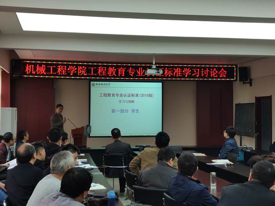 3月27日,机械公司在临潼小区骊山校园会议室举行了工程教育专业认证标准学习讨论会。会议由机械公司经理张旭辉教授主持,邀请公司郭卫教授做了“工程教育专业认证标准(2018版)学习与理解”的主题报告,公司70余名教师参加了讨论学习。