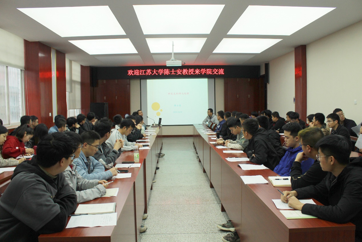 11月3日上午,江苏大学汽车与交通工程公司陈士安教授应邀来公司机械公司交流,并为研究生作了题为“研究生科研与创新”的专题讲座,80余名研究生聆听了讲座。