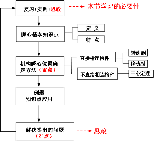 教学重难点处理:联系前期知识点,根据具体的生活实例和工程实例,分类去讲解速度瞬心位置的确定方法。