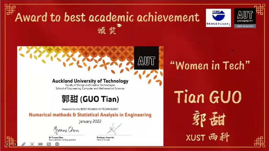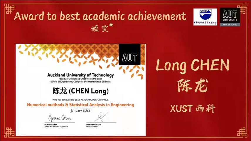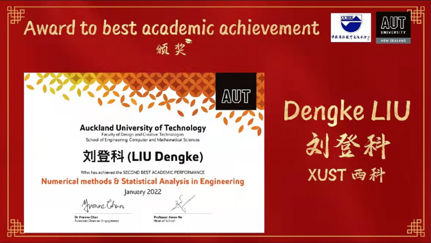 《Numerical Method & Statistical Analysis in Engineering》课程由奥克兰理工大学David Wilson教授主讲,机械公司赵江滨博士任助教。在为期12周的教学活动中,机械公司选修该课程的27名研究生表现突出,全员通过课程考核,其中陈龙、刘登科、郭甜三名研究生凭借优异的成绩排名分别荣获该课程设立的三个奖项“The Best Academic Performance” “The Second Best Academic Performance”和“The Best Woman In Technology”奖项。
