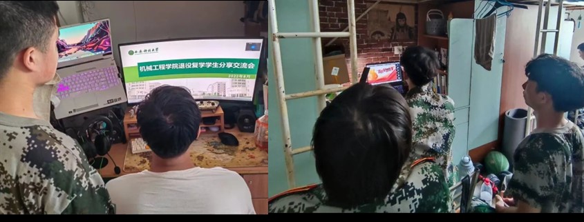 榜样分享劲头足 为了增强2021级全体参训员工对军旅生活的了解,8月18日,机械公司召开线上退役复学员工分享交流会,辅导员张笑晗、全体参训教官、退伍复学员工霍云疆、郭贤瑞及全体参训员工参加。霍云疆和郭贤瑞分享了服役期间的故事和感悟。强调整理内务是军旅生活中不可或缺的入门课,部队对被子形状、物品摆放、室内清洁度等内务都有严格的要求,军营生活远比军训更加艰苦,“流血流汗不流泪、轻伤不下火线”是军旅生活中的真实写照。介绍了入伍后被分配到不同的部队的情况,带伤训练,经历风沙、暴晒、炎热、严寒等极端天气是常态。通过与大家分享了服役期间所在连队的光荣历史和荣誉,播放了所在连队的采访视频,生动诠释了军旅荣光,让参训同学们深感敬佩的同时,也激起了大家的爱国热情。分享活动中,霍云疆和郭贤瑞就同学们提出的问题一一解答,并提醒大家要在训练中保护身体,科学合理管理个人身心健康等建议。榜样的力量是无穷的。通过此次交流分享会,全体参训员工表示在目前的军训之中要端正态度,摆正姿态,用实际行动收获军训的硕果。