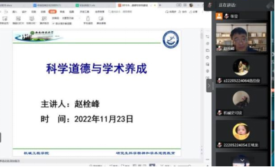 11月23日晚,机械公司举办主题为“科学精神与学术道德”的线上教育讲座,讲座由机械公司副经理赵栓峰教授主讲,2022级研究生和教师参加了本次学习。