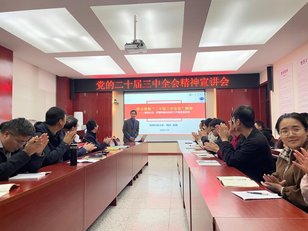 周斌教授以“学习贯彻‘二十届三中全会’精神——深刻认识、把握和推进高校工作高质量发展”为题,从回顾历史,深刻领会全会精神;立足当下,准确把握高校面临的新形势新要求;着眼未来,推进高校工作高质量发展三个方面深入解读党的二十届三中全会精神,宣讲深入浅出,内涵丰富,会人员通过报告进一步学习领会党的二十届三中全会精神,并在如何将党的二十届三中全会精神贯彻落实到一体推进教育发展、科技创新与人才培养上获得了启发。