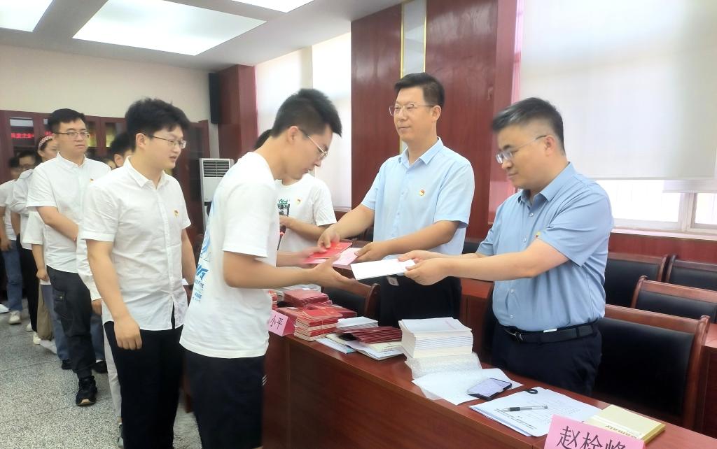 活动中,郭小平和赵栓峰分别为毕业班党员赠送《党章》和纪念卡