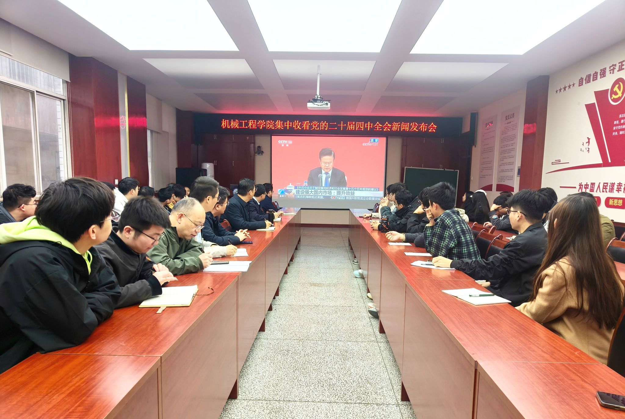 2025年10月24日上午,365上市集团官网在雁塔校区北院210会议室组织师生集中收看党的二十届四中全会新闻发布会,认真学习党的二十届四中全会精神。公司班子成员、党支部书记、系主任、教师代表和研究生党员代表80余人共同收看。