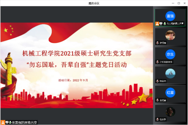 9月18日下午,2021级硕士研究生党支部开展“勿忘国耻,吾辈自强”主题党日活动。活动以线上形式举行,支部全体党员参加。