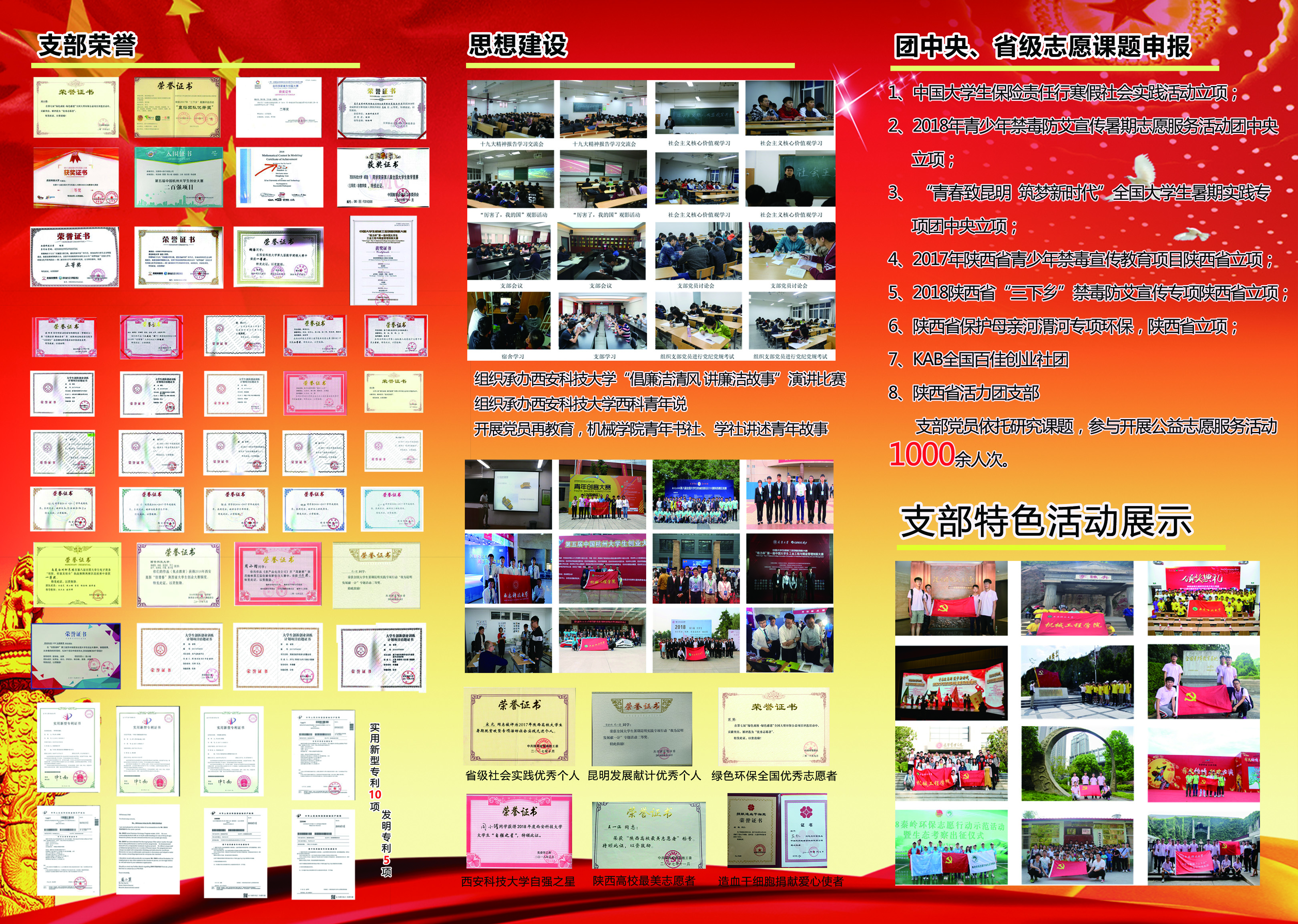思想建设方面:支部强化制度落实,严抓过程管理,坚持“两学一做”常态化教育,辅以网络思政学习新模式,及时开展时政及报告的学习,积极承办西科倡廉演讲比赛,组织成员参加西科青年说,并推进公司青年书社、青年学社的学习交流,与此同时,参与形式多样的主题实践活动被新闻媒体报导,支部成员通过身体力行的走访及宣传获陕西省教育厅官网点赞。用脚步丈量思想的提升,用荣誉见证成长的领悟。