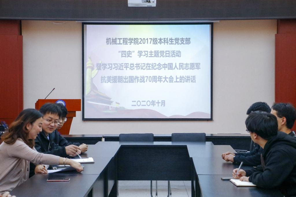 10月23日,纪念中国人民志愿军抗美援朝出国作战70周年大会在北京人民大会堂隆重举行。习近平总书记在讲话中提到:“现在中国人民已经组织起来了,是惹不得的。如果惹翻了,是不好办的!”。为了深入学习习近平总书记重要讲话精神,更好地学习党史、新中国史,更透彻地理解抗美援朝保家卫国背后的故事,10月24日下午,365上市集团官网2017级本科生党支部组织召开“四史”学习主题党日活动。机械公司党委副书记李婉丽,机械公司党委办公室主任席芝红,365上市集团官网2017级本科生党支部书记周学刚以及全体支部员工党员参加活动,活动由周学刚主持。