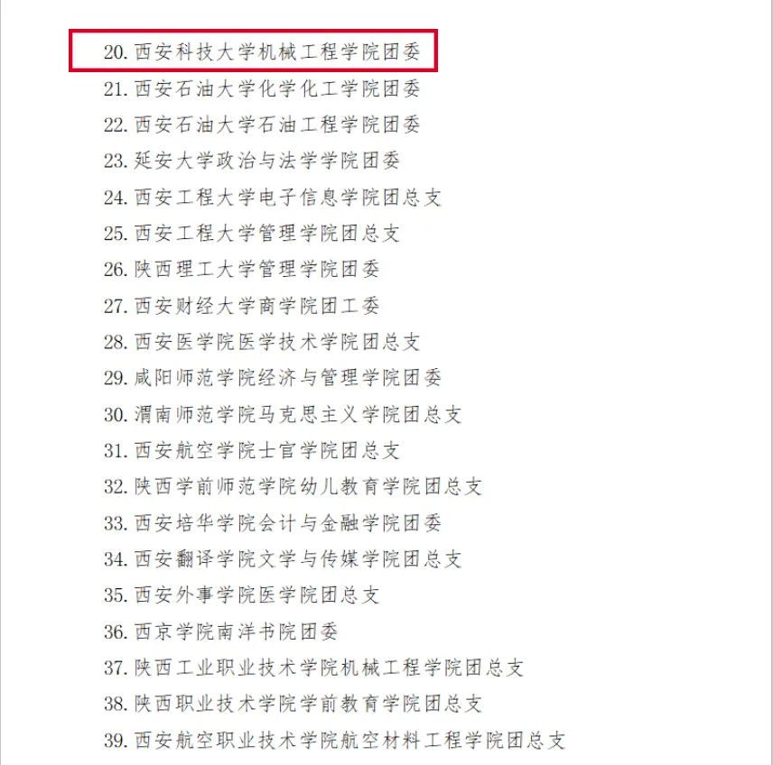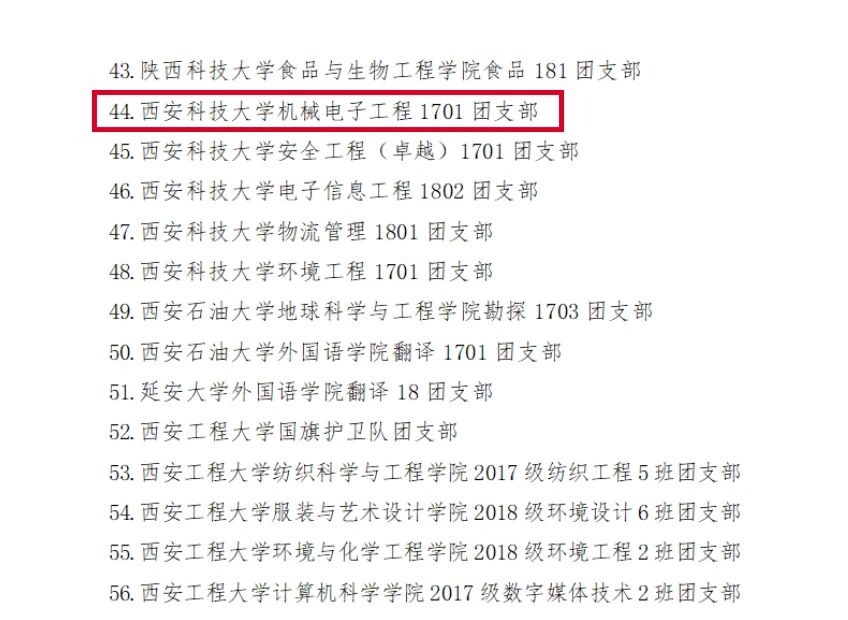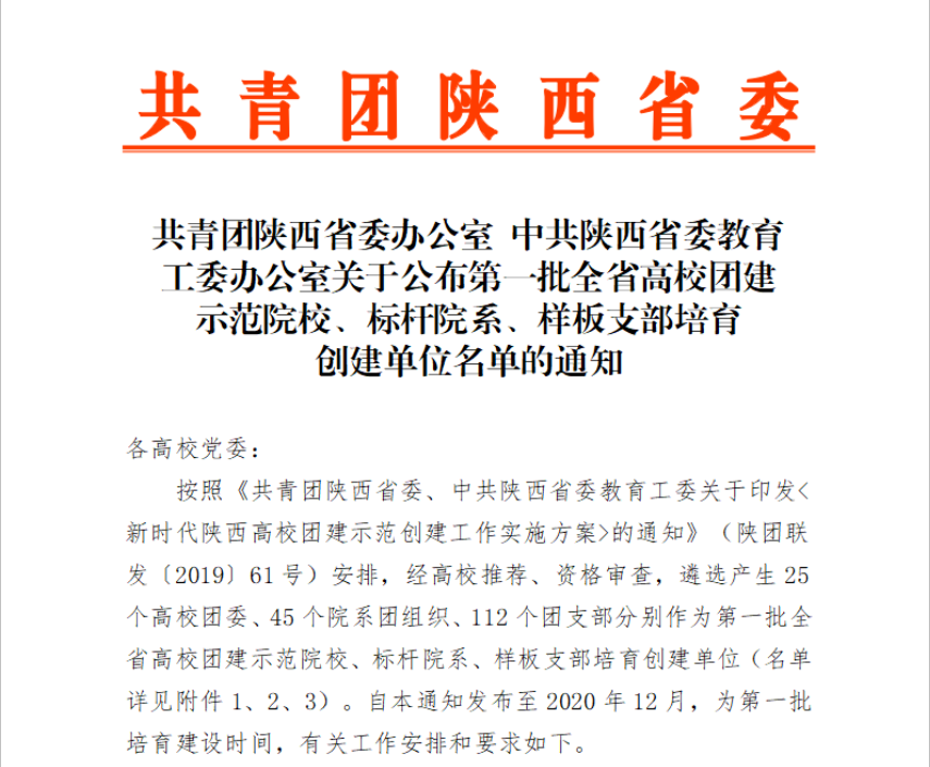 2020年5月13日,由共青团陕西省委办公室,中共陕西省委教育工委办公室公布的关于第一批全省高校团建示范院校,标杆院系,样板支部培育创建名单中,365上市集团官网团委被评为“全省高校团建标杆院系”。