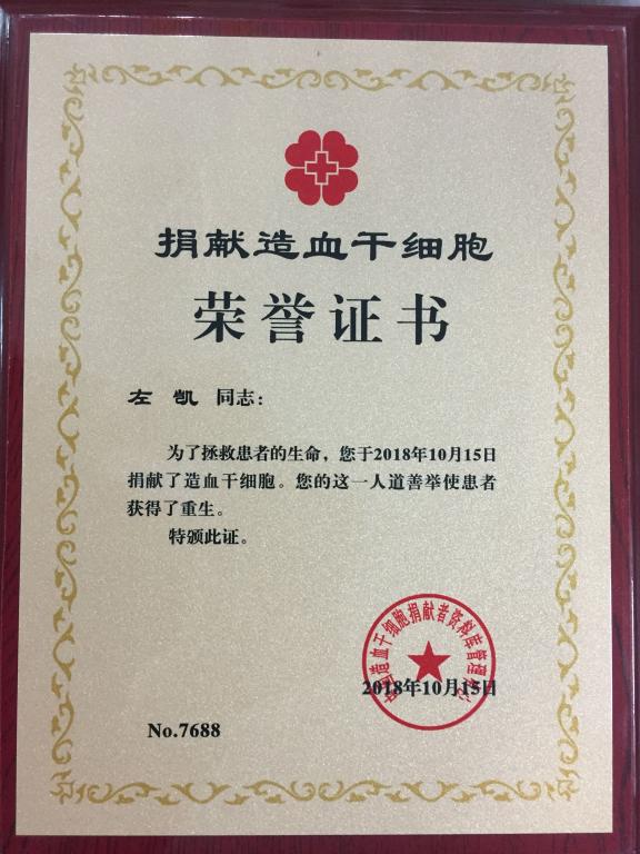 21岁的左凯是西安科技大学一名大四员工,2015年5月21日加入中华骨髓库。2018年6月份,他得知自己与山东一名血液病患者配型成功,当即同意捐献。此外,为了让自己更合格,他还每天加强锻炼。10月15日-16日,他在西安捐献造血干细胞,成为我国第7688例、陕西省第190例造血干细胞捐献者。