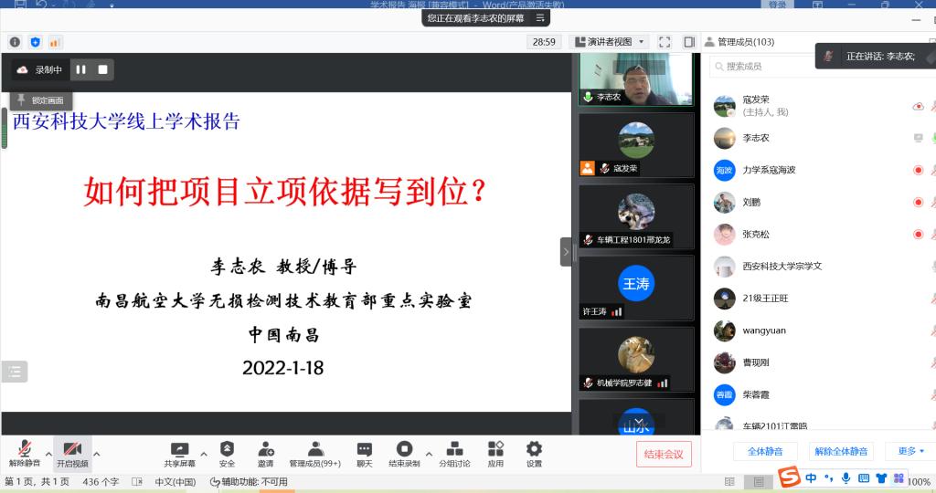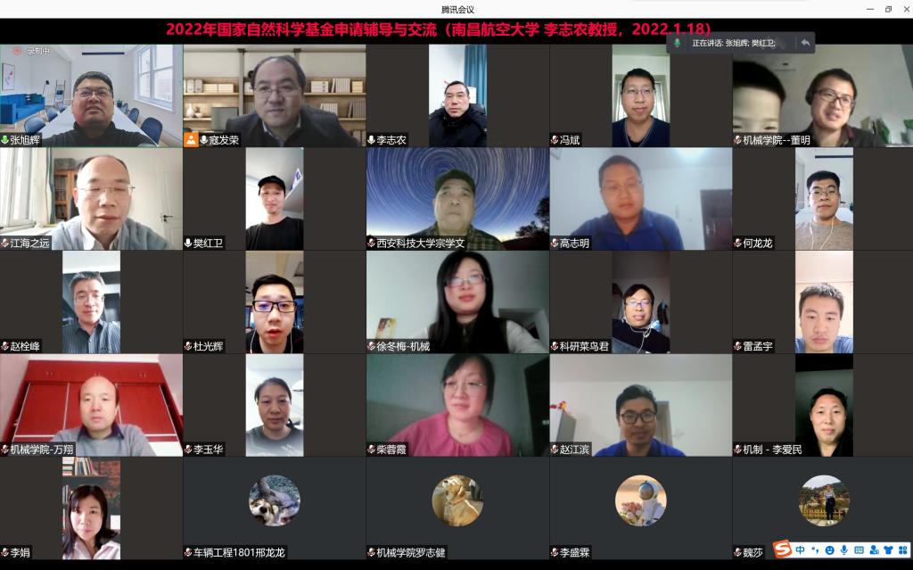 1月18日下午机械公司邀请南昌航空大学李志农教授,在线作了题为“如何把项目立项依据写到位”国家自然科学基金申请辅导报告,公司班子成员、各学科带头人及学术带头人等200余名师生参加了报告会。会议由副经理寇发荣主持。