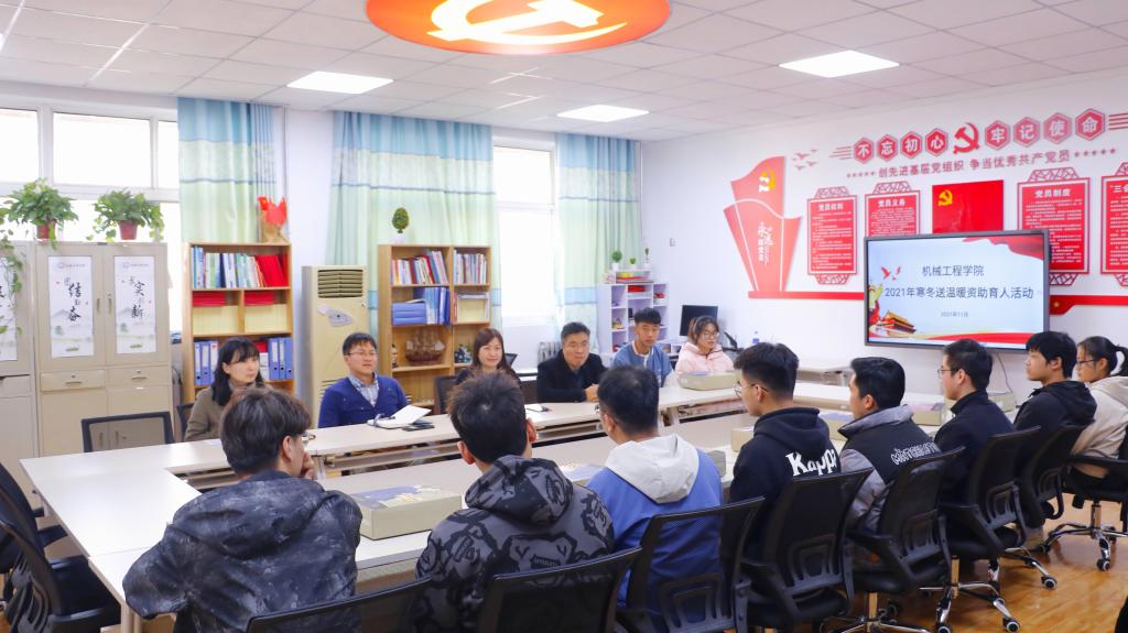 机械公司于11月22日“小雪”节气当日下午在骊山校园公司党员活动室举办“寒冬送温暖”资助育人座谈会。公司党委副书记尹弘、副经理赵栓峰、团委书记周学刚和资助专项负责辅导员郭静以及家庭经济困难员工代表参加本次活动。