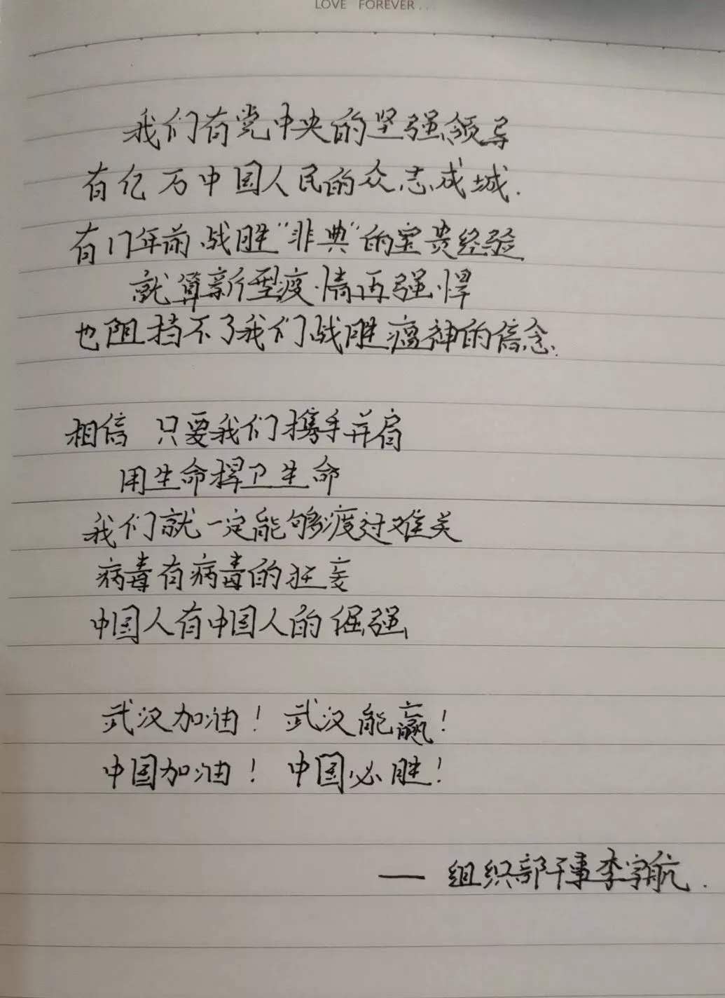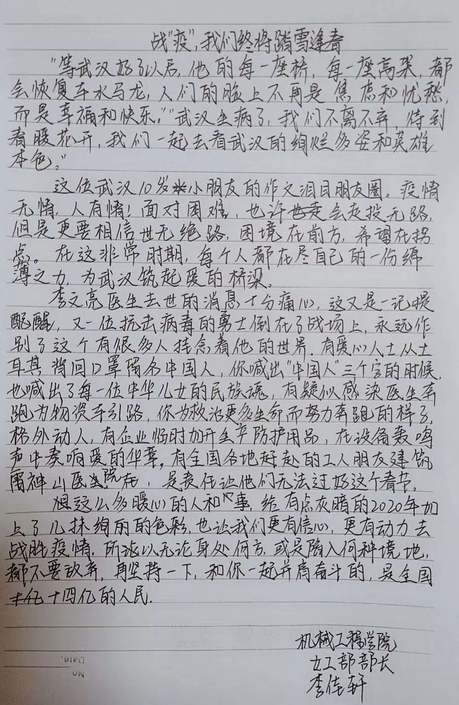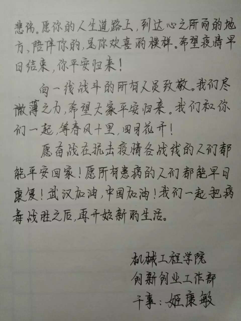 一方有难,八方支援。在此危难之际,公司机械学子也与祖国同呼吸,以赤忱之心,为武汉献上最诚挚的祝福。