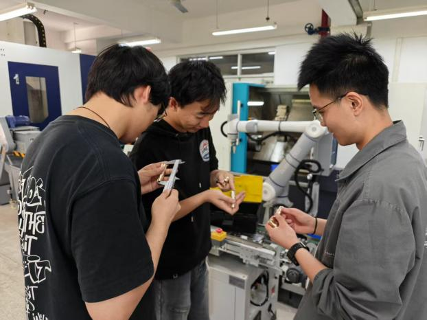 “用数控机床加工黄铜印章,就像给传统工艺装上了‘智能大脑’。”智能制造专业员工小石展示作品时感慨,“通过数字化设计,我们能轻松实现手工难以完成的复杂造型。”;“与手工篆刻不同,数控加工需要将艺术创意转化为精确的数字指令,每一个参数的调整都会影响最终效果。”机设专业的员工小李介绍道;“我们尝试将院徽也刻在竹节印章上,通过数控加工的浮雕工艺,让文字既有立体感又不失篆刻韵味。”机设专业的员工小杨展示作品时说道;“黄铜质地较硬,切削过程中容易产生碎屑和热变形,我们通过调整冷却液流量和主轴转速,才保证了竹节纹理的细腻度。”机卓专业员工小王介绍。