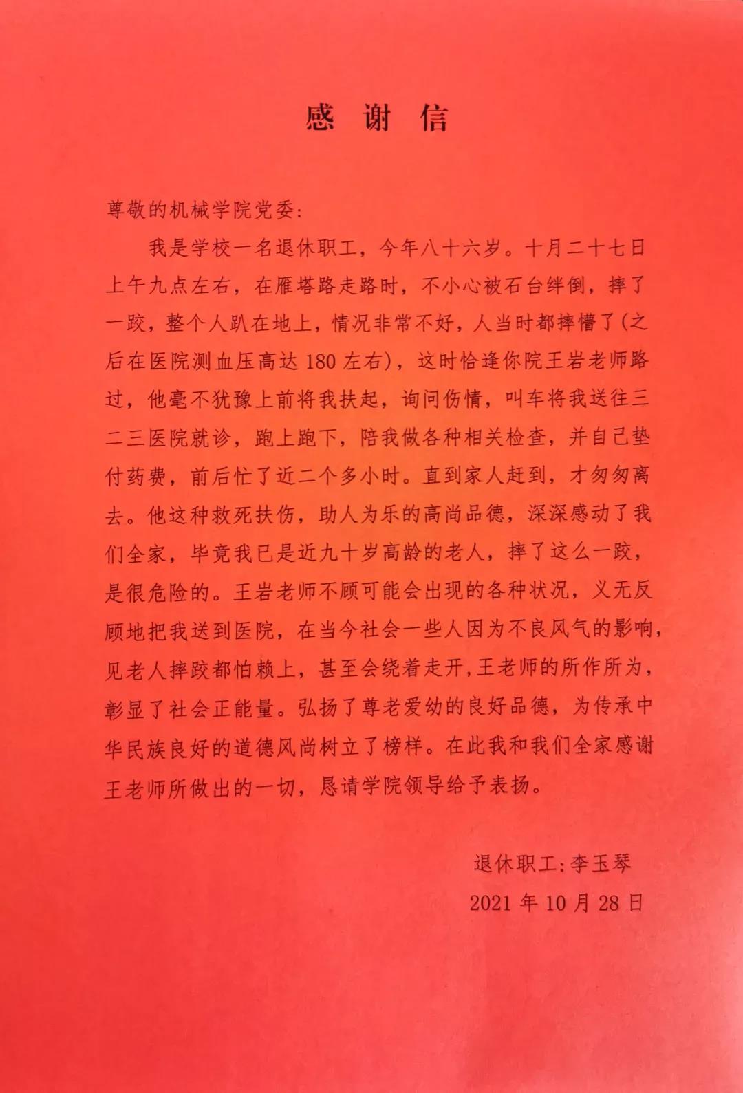 11月3日,公司党委收到一封来自退休职工的感谢信。八十六岁高龄的李奶奶在信中讲述了公司机械电子系青年教师王岩偶遇她不慎摔跤时给予无私帮助的前后经过。