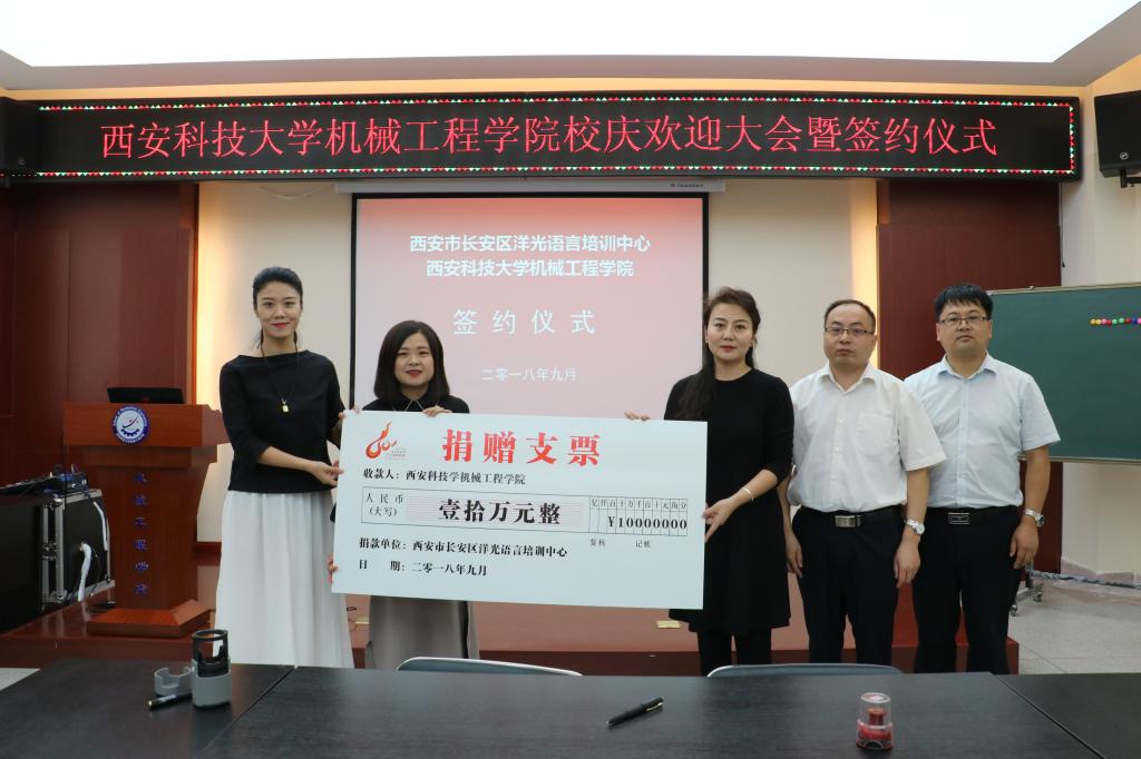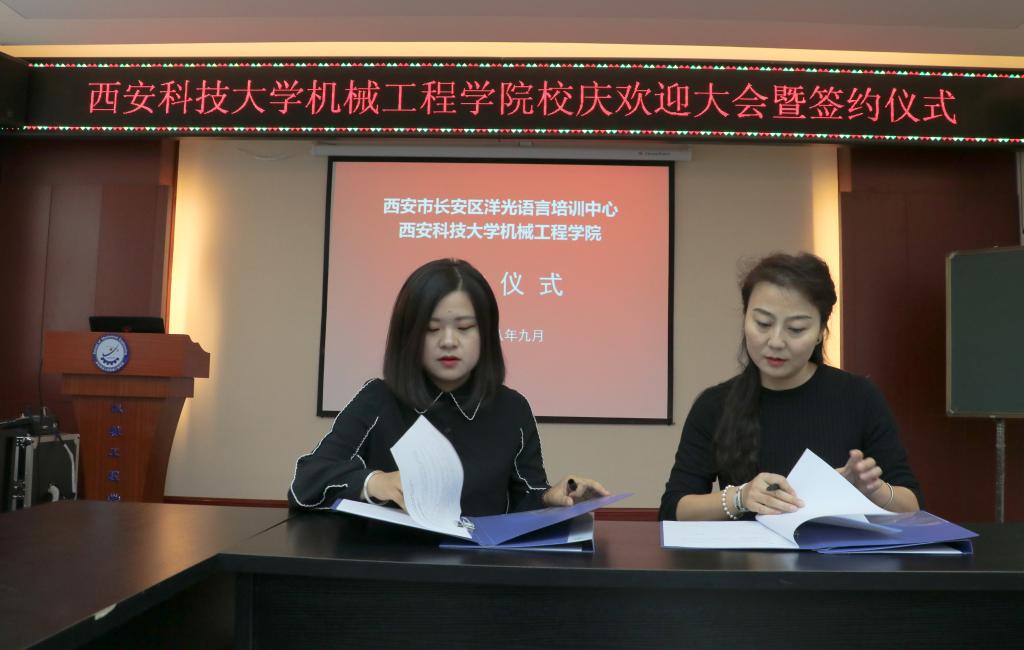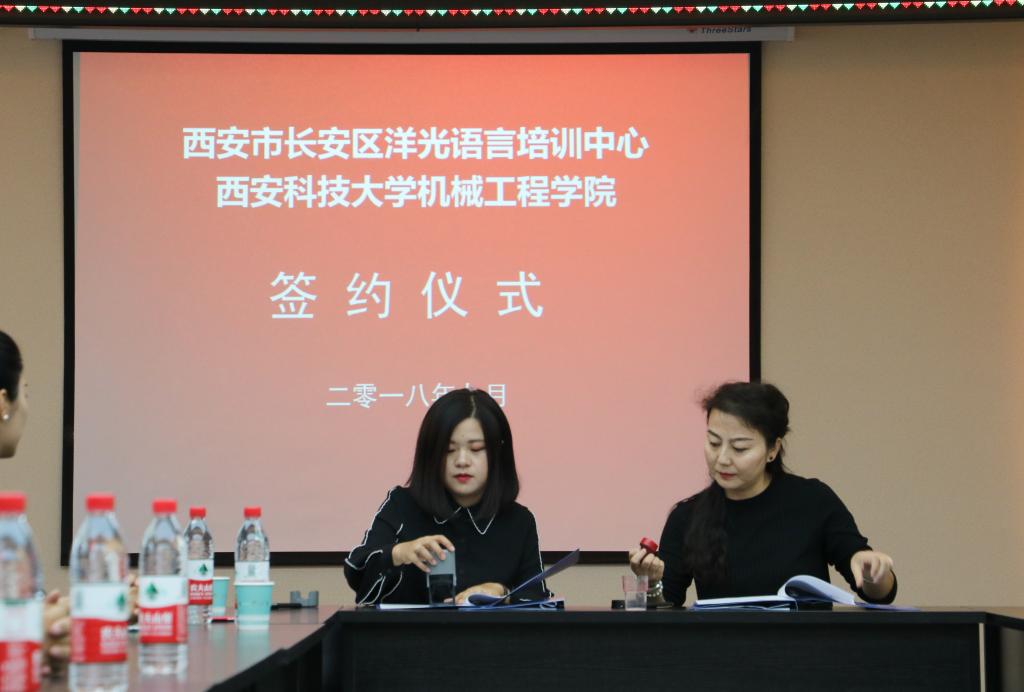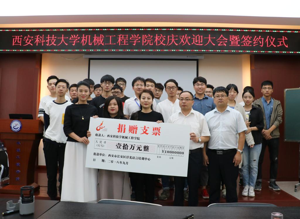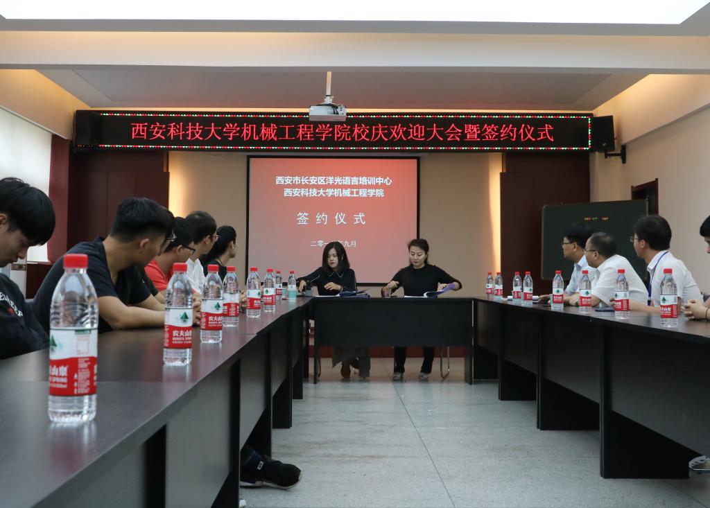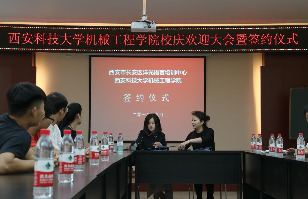 2018年9月14日上午,洋光外语外语培训机构一行人赴365上市集团官网签署阳光外语—365上市集团官网企业捐赠协议,签约仪式在临潼校区机械公司会议室进行,仪式前双方就人才培养、外语教学等议题进行了友好深入的交流,并由洋光外语培训机构与365上市集团官网分别代表两家单位签署了捐赠协议。参会的公司领导有机械公司党委书记汪卫兵、经理张旭辉、党委副书记李婉丽、副经理寇发荣,公司30余名师生也参加了签约仪式。