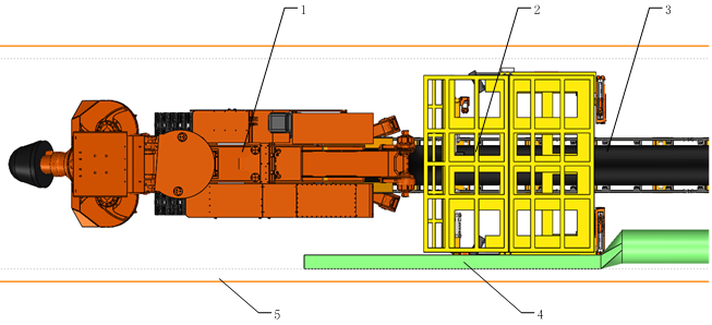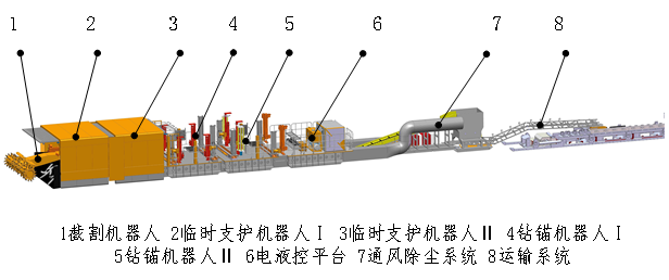 1-掘进机器人 2-履带式龙门钻锚机器人 3-二运皮带 4-风筒 5-巷道
